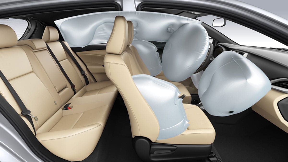Toyota Yaris phiên bản mới được trang bị hệ thống 7 túi khí gồm 2 túi khí phía trước, 2 túi khí bên hông phía trước, 2 túi khí rèm và 1 túi khí đầu gối người lái sẽ đảm bảo an toàn cho hành khách và người lái trên mọi hành trình.