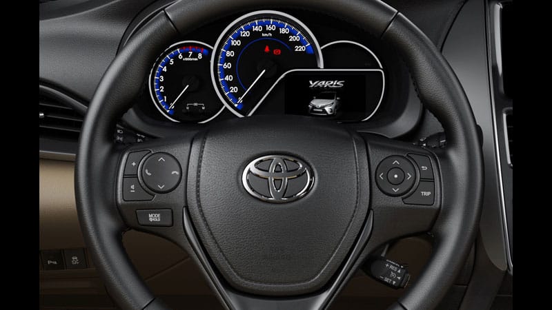 Tay lái của Yaris mới được thiết kế sang trọng, tinh tế với chất liệu da, 3 chấu vừa vặn với vị trí đặt tay. Ngoài ra vỏ vô lăng có thể điều chỉnh 2 hướng và tích hợp các nút điều chỉnh âm thanh giúp tối đa hóa tiện ích sử dụng.