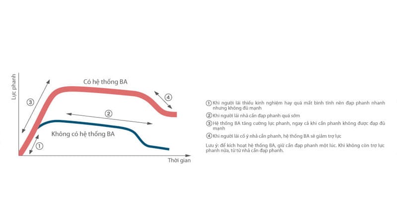 Với bộ cảm biến áp suất dầu phanh, hệ thống hỗ trợ lực phanh khẩn cấp BA tự động gia tăng thêm lực phanh trong trường hợp khẩn cấp, mang lại sự an tâm cho hành khách trên mọi chuyến đi.