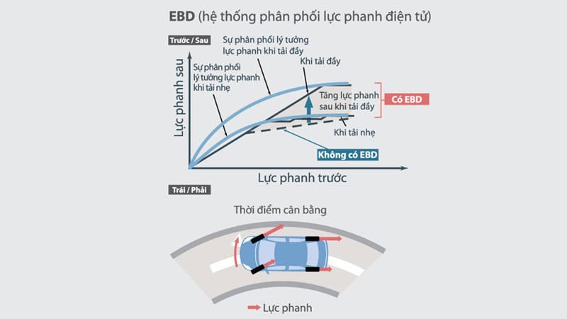 EBD phân bổ lực phanh hợp lý đến các bánh xe, giúp nâng cao hiệu quả phanh, đặc biệt khi xe đang chất tải và vào cua.